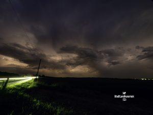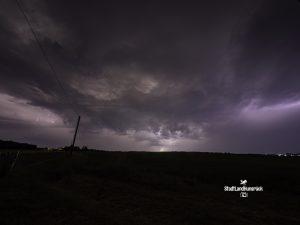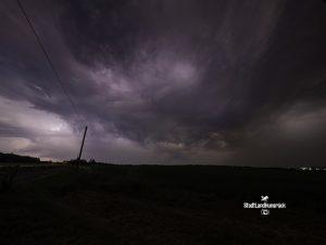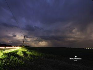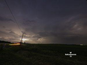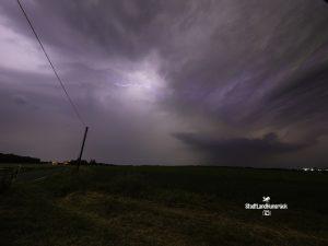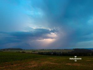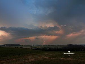 Die Gewitterzelle links (orangener Pfeil) hatte einige Erdblitze im vorüberziehen zu bieten. Die andere kam genau auf mich zu und hatte nur selten Erdblitze im Gepäck, dafür aber richtige Häuserrüttler. Hauptsächlich waren es Wolkenblitze in sehr schneller Abfolge. Es war wie in der Disko damals. Der deutsche Wetterdienst gab bis zu 200/sec an. Das kam hin.