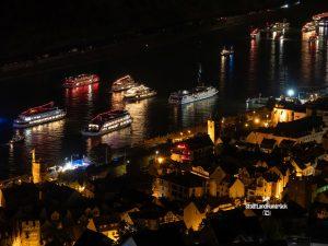 Das Feuerwerk beginnt gegen 21:30 Uhr, kurz nachdem die historische Altstadt beleuchtet wurde. Die Veranstaltung kann von den Schiffen oder vom Ufer aus genossen werden. Zudem eröffnet ab 13:00 Uhr der traditionelle Weinmarkt in Oberwesel, auf dem über 150 Weine aus der Region angeboten werden. Begleitet wird das Fest von Live-Musik, die ab 19:00 Uhr von einer Partyband gespielt wird und bis spät in die Nacht für Stimmung sorgt.